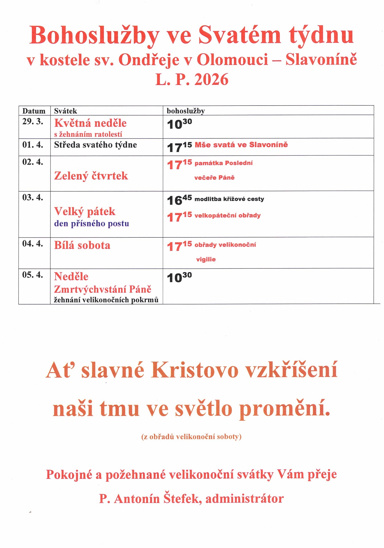 Nezapomeňme si vykonat svátost smířeníať v naší farnosti, či kdekoliv jinde, aby nebyl nikdo, kdo by o velikonocích nepřijal svátostného Krista do svého čistého srdce, a tak mu poděkoval za dar vykoupení.