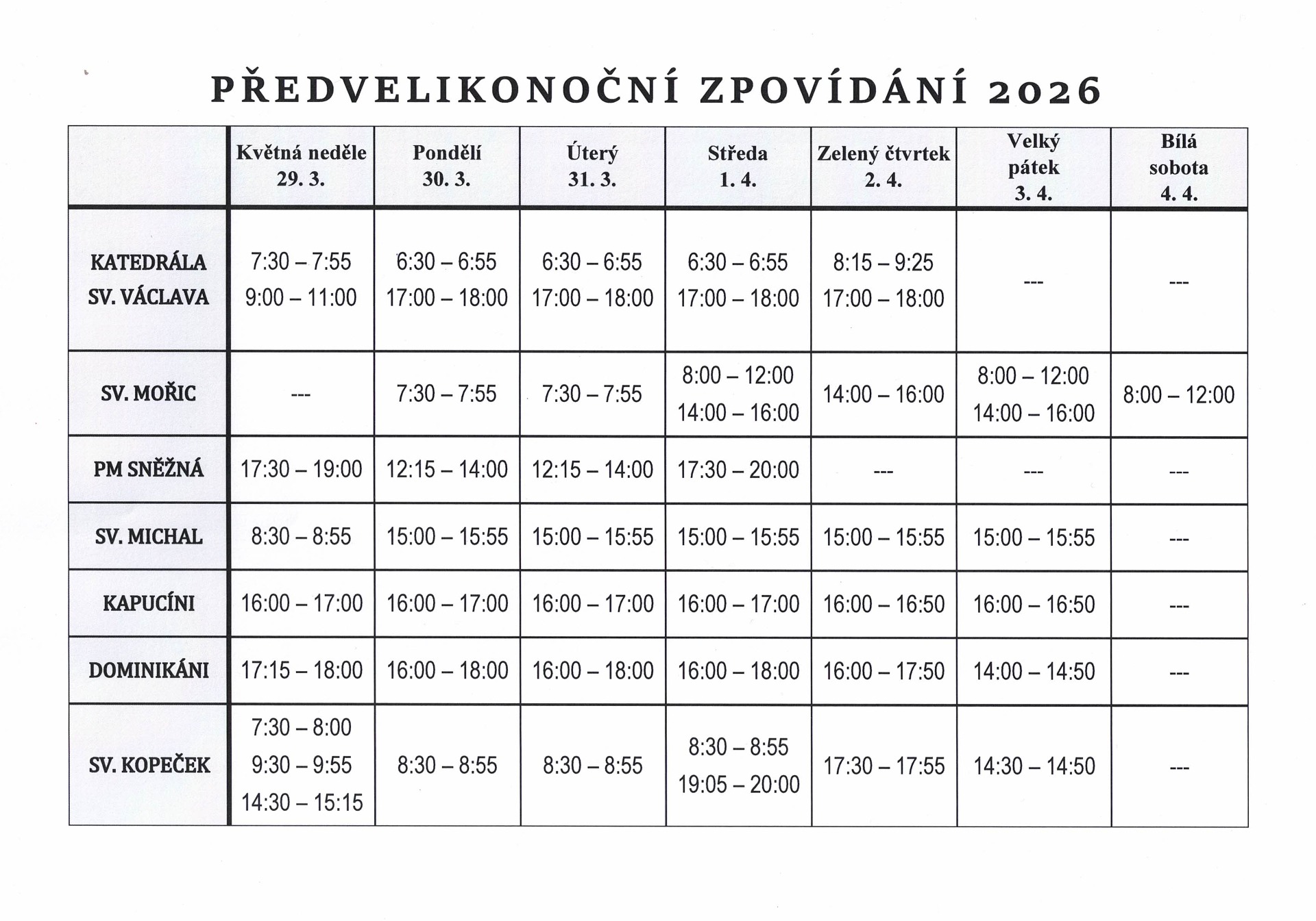 Vždy půl hodiny před mší sv. nebo podle domluvy i v jiný termín.